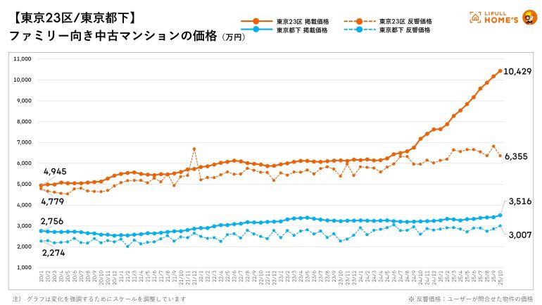 ファミリー向き中古マンションの平均掲載価格は、東京23区で1億429万円(前年同月比145.3%)、東京都下で3,516万円(前年同月比109.1%)となり、計測開始以降の過去最高価格を更新した。