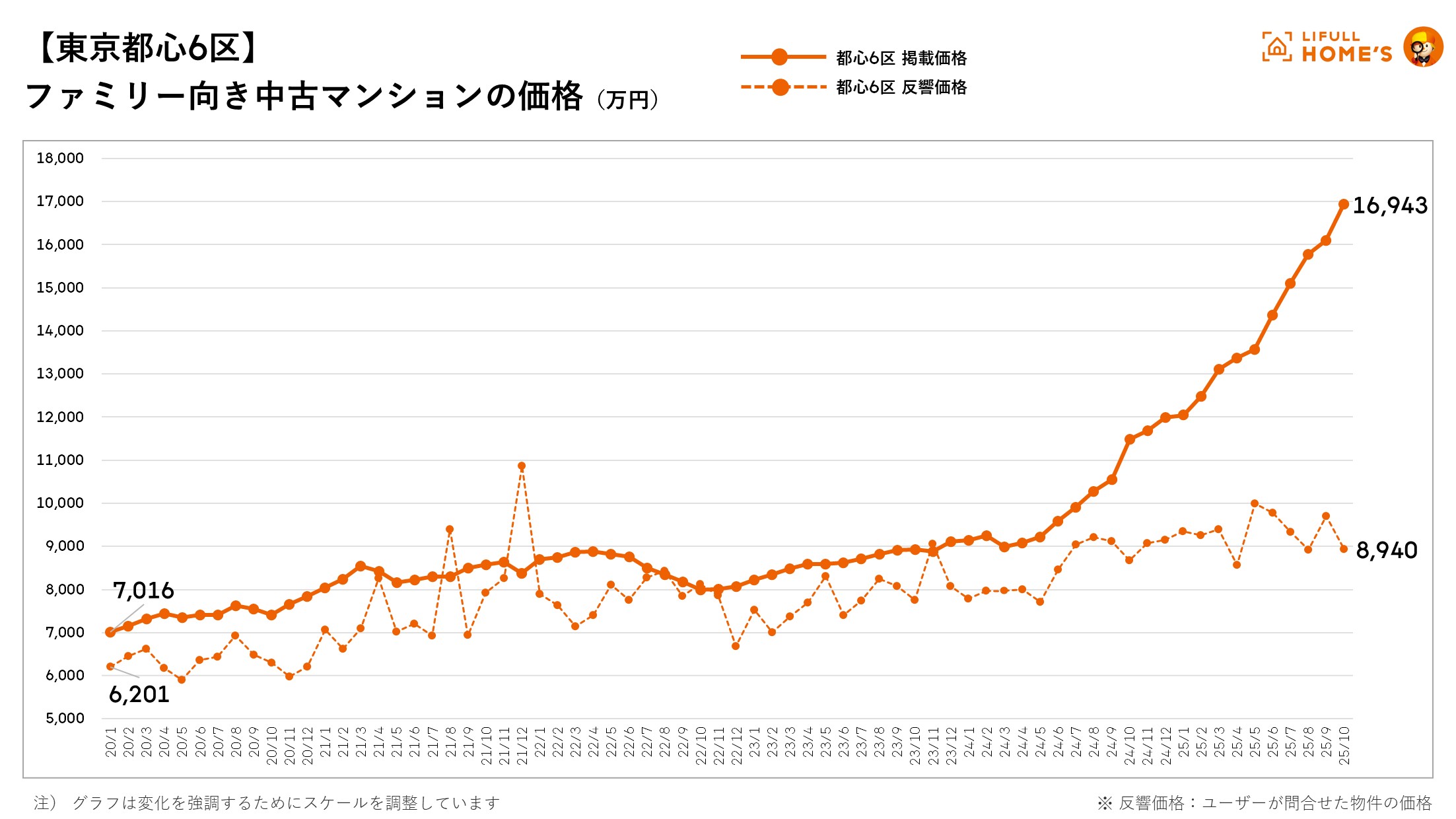 東京都心6区(千代田区、港区、中央区、新宿区、渋谷区、文京区)では1億6,940万円(前年同月比147.6%)と特に高い上昇率となっており、東京都内の平均価格上昇を牽引している。