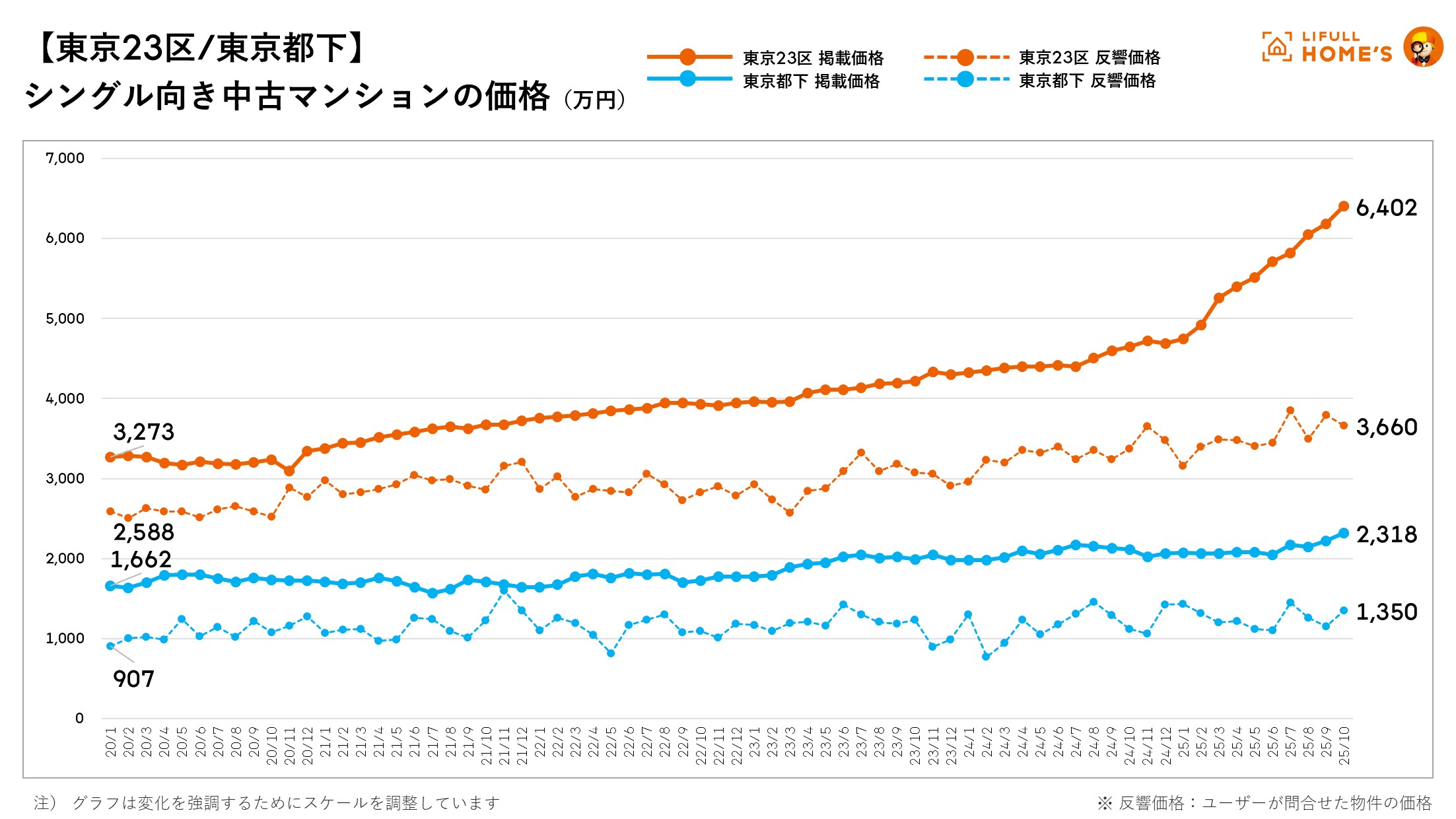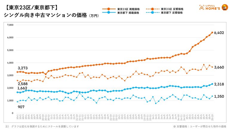 シングル向き中古マンションの平均掲載価格は、東京23区で6,402万円(前年同月比137.8%)、東京都下で2,318万円(前年同月比109.7%)となり、計測開始以降の過去最高価格を更新した。