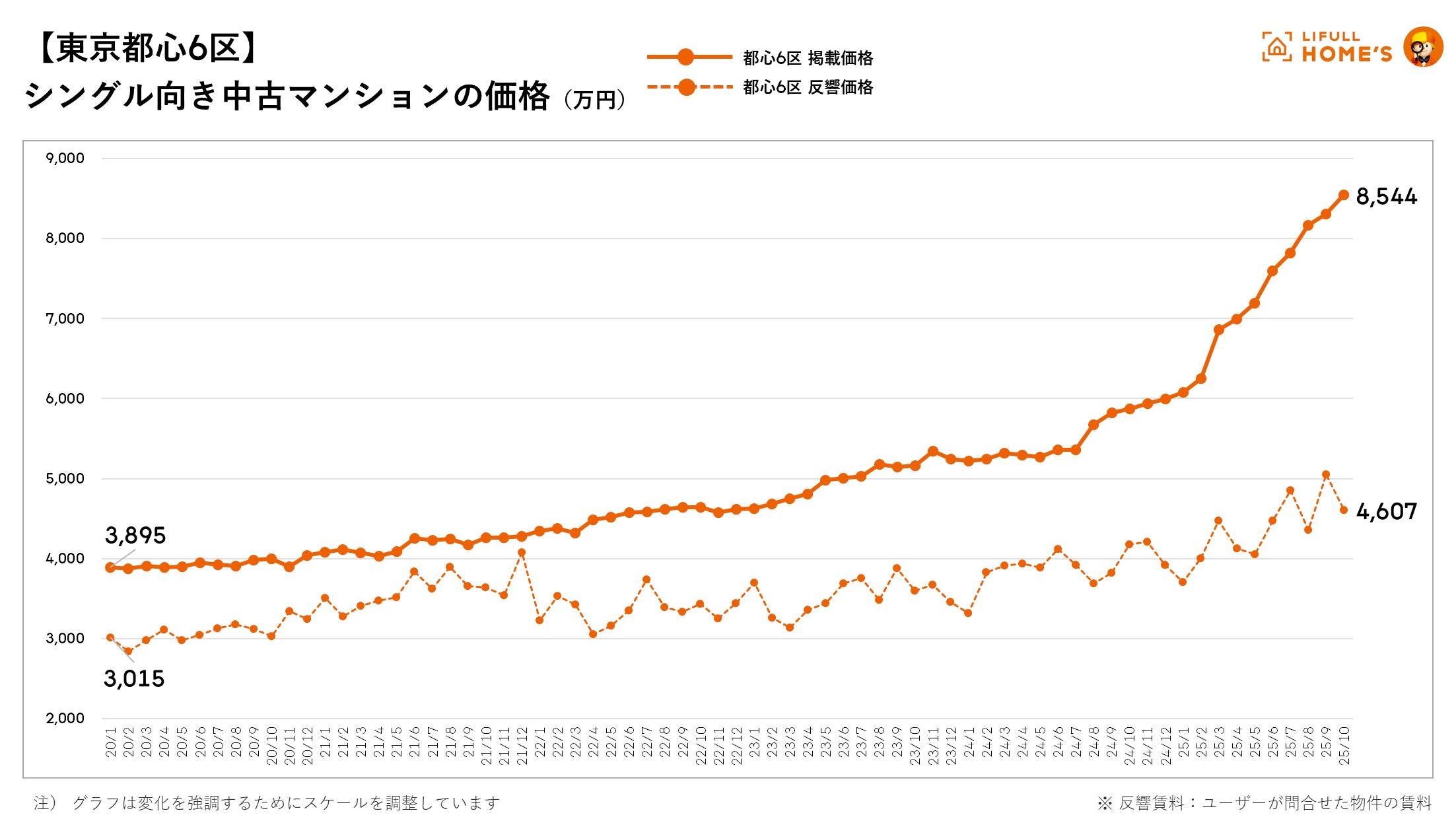 東京都心6区(千代田区、港区、中央区、新宿区、渋谷区、文京区)では8,544万円(前年同月比145.5%)となり、計測開始以降の過去最高価格を更新した。