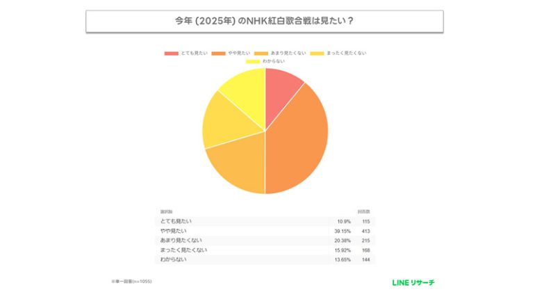 大晦日のイベントとして家族で『NHK紅白歌合戦』を観る人は多いだろう。2025年11月14日には、紅組と白組の出演アーティストが発表されて話題を集めた。ライトコースのセルフ型「Quickアンケート」を活用して、旬のトレンドや話題の出来事を調査している『LINEリサーチ』は、全国の15歳から69歳の男女を対象に『第76回NHK紅白歌合戦』について2025年11月14日に発表された出演者を元にアンケート調査を実施した。