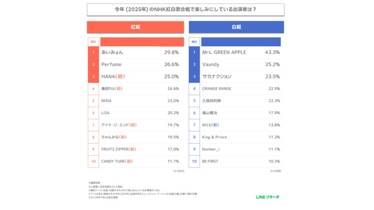 紅組と白組の発表された出演者で、どのアーティストが観たいのか。紅組は、あいみょんが1位で、約3割が観たいと回答している。それにPerfume、HANA、幾田りら、MISIAが続く結果になった。6位以降では、LiSA、アイナ・ジ・エンド、ちゃんみなが僅差で並んだ。紅組は、初出場の出演者への期待が高く、10位以内にHANA、幾田りら、アイナ・ジ・エンド、ちゃんみな、FRUITS ZIPPER、CANDY TUNEの6組がランクインした。