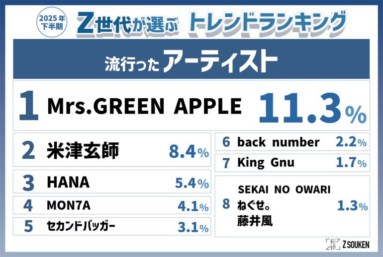『Mrs. GREEN APPLE』が2023年下半期から連続1位で“Z世代の顔”に。「今日好き」で話題になった『MON7A』は“TikToker”と“アーティスト”の2部門でランクイン。