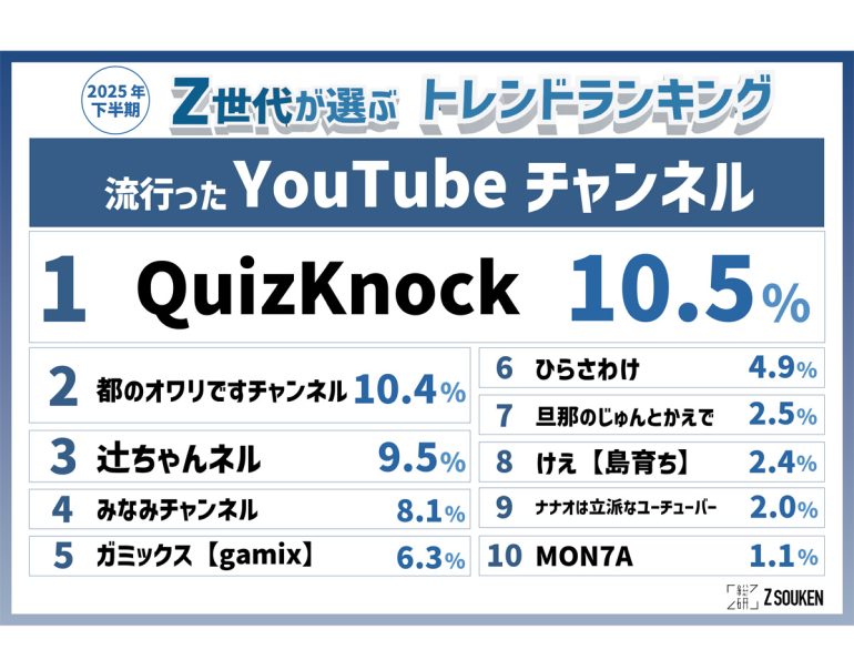 知的エンタメ集団の『QuizKnock』が急上昇1位に輝いた。今年で10周年を迎え、さらに注目を集める存在になっているようだ。『都のオワリですチャンネル』や『ガミックス』などの単独YouTuberもランクイン。