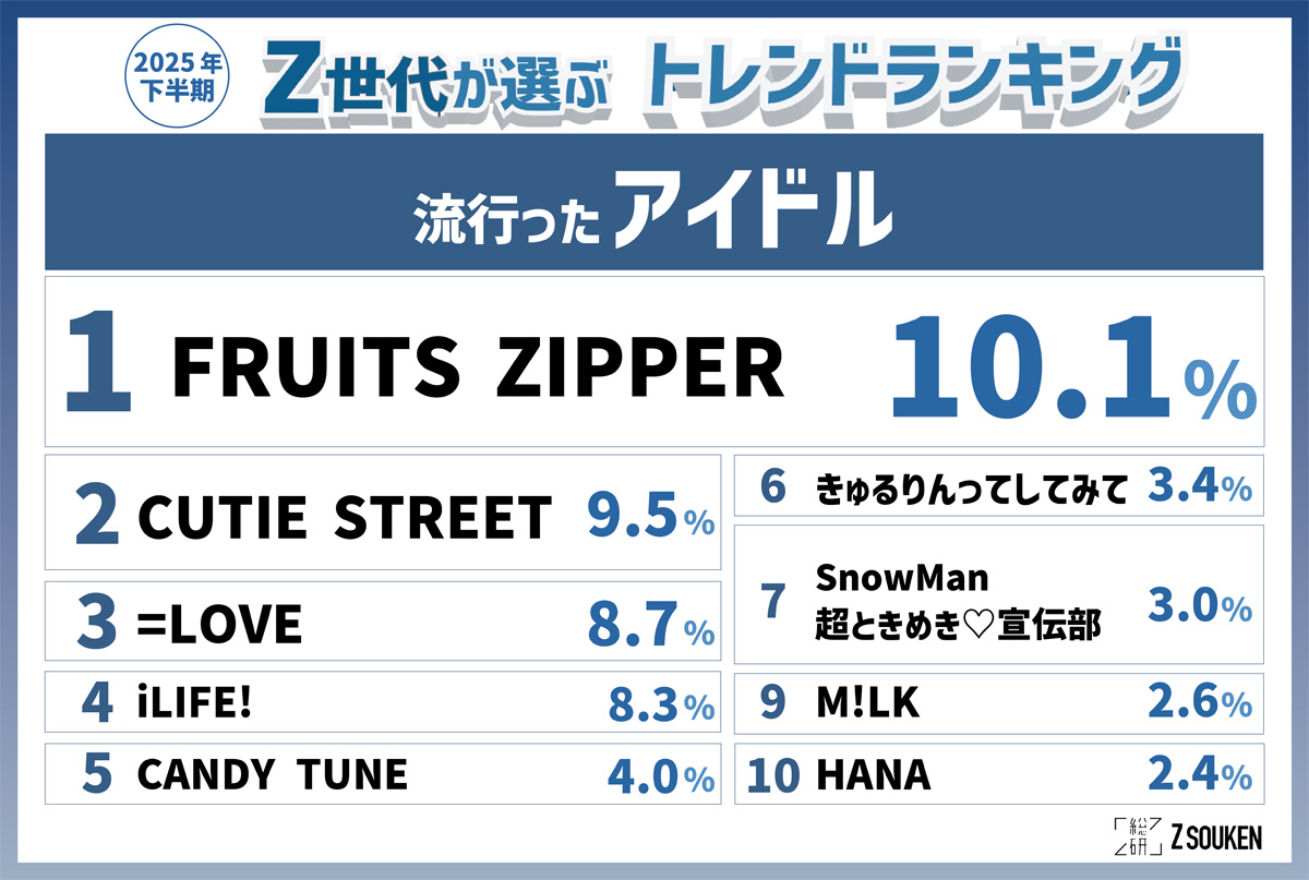 KAWAII LAB.が手掛ける『FRUITS ZIPPER』『CUTIE STREET』、指原莉乃がプロデュースする『=LOVE』など日本のアイドルが上位3位にランクイン。