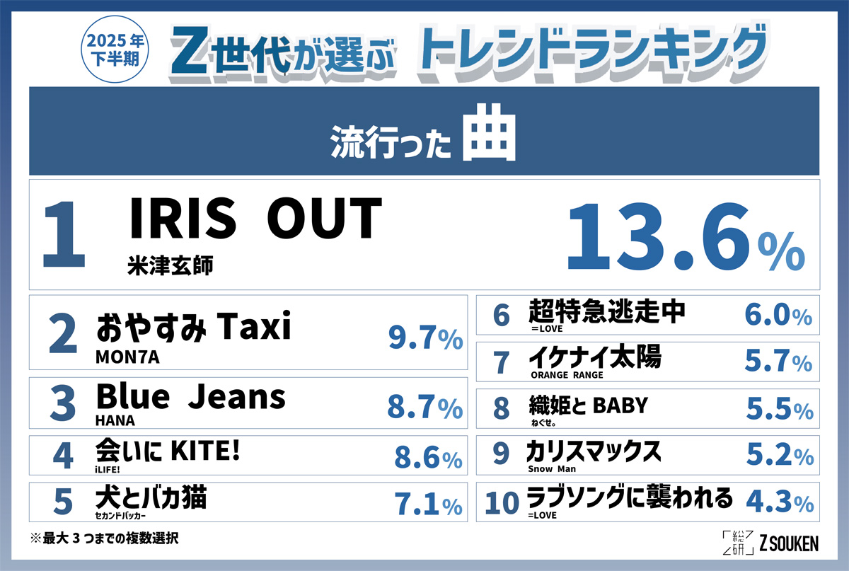 『チェンソーマン レゼ篇』の主題歌で話題の『IRIS OUT』がトップに。歌詞や世界観を重視する傾向も見られる。ショート動画の音源で人気なアイドルソングも引き続き多数ランクインしていた。