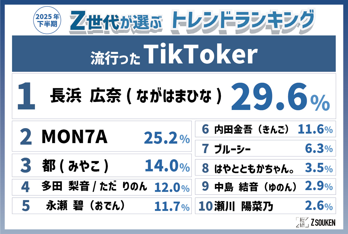 中でも、出演者の長浜広奈さん、MON7Aさんが流行ったTikToker1位と2位に。その他、流行った曲・流行った言葉にお二人に関する話題がランクイン。