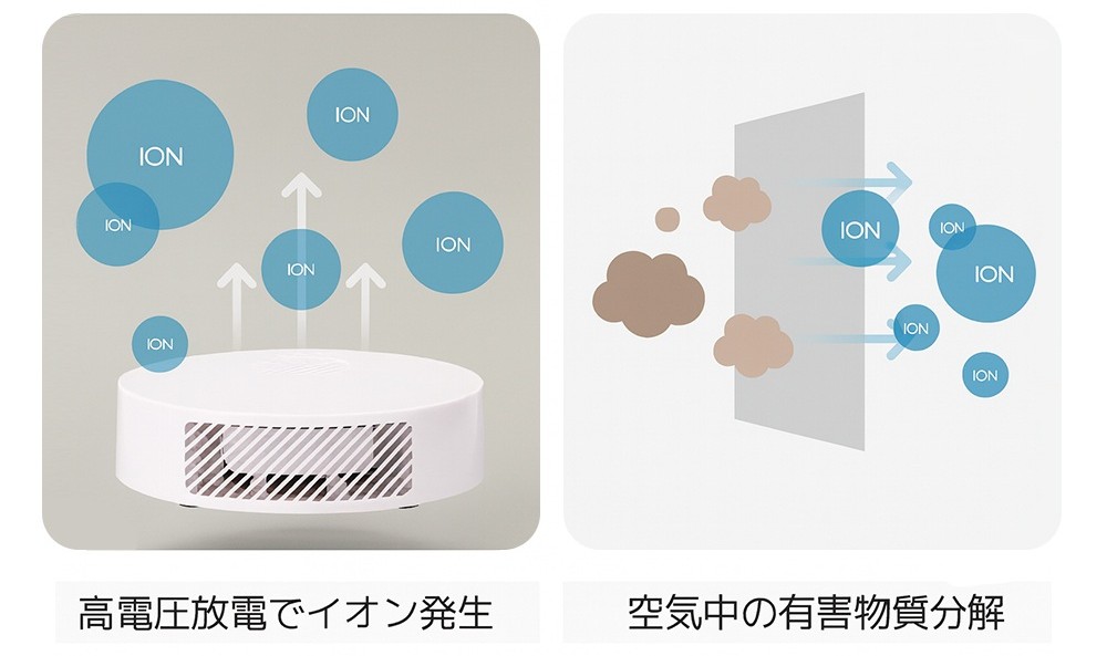 「PURRAIR2」は、プラズマを利用して空気中の粒子をイオン化するイオナイザ方式を採用。独自設計の電子回路がファンとプラズマ発生電流を効果的に制御し、プラズマ活性種の生成を最適化。これにより、有害ガスや悪臭の原因物質に直接アプローチし、強力に脱臭する。