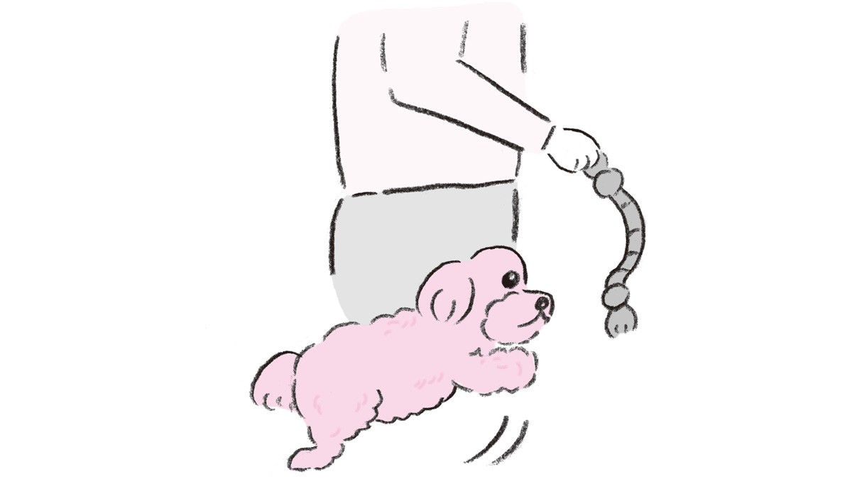 ロープなどのおもちゃを持って追わせる。犬に咬ませる部分は絶対に持たないよう注意。