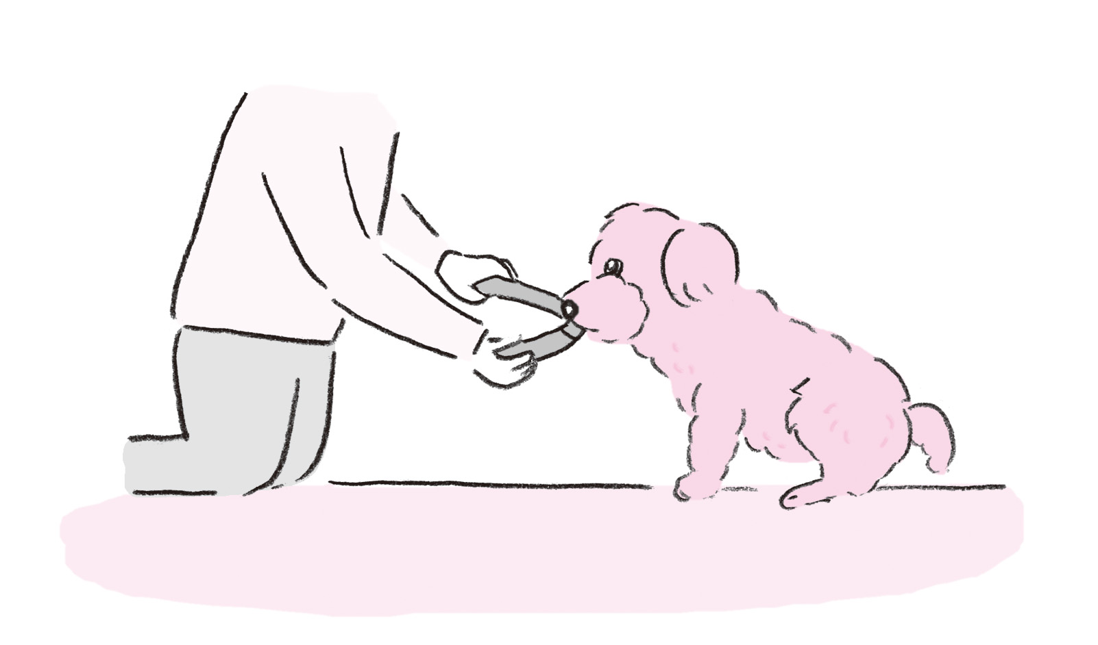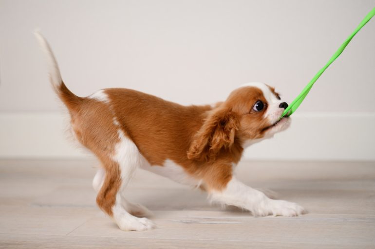 咬んでいるほうとは反対側のおもちゃの端を持って遊びを再開する。引っ張り合いの途中でピタッとおもちゃの動きを止めると、つまらないのでおもちゃを離す。離したところでおもちゃを追わせて遊びを再開すると、くり返すうちに動きを止めるだけでおもちゃを渡してくるようになる。