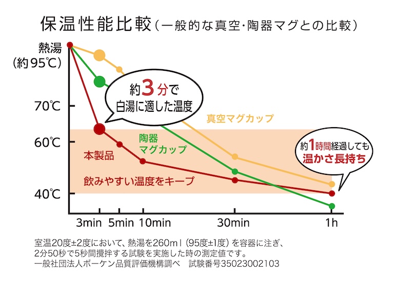 『白湯専科マグカップ』はステンレス製で、内側と外側の間に吸熱剤が充填されている。熱湯を注ぐと約3分で、飲み頃となる65~60℃の間まで下がる。