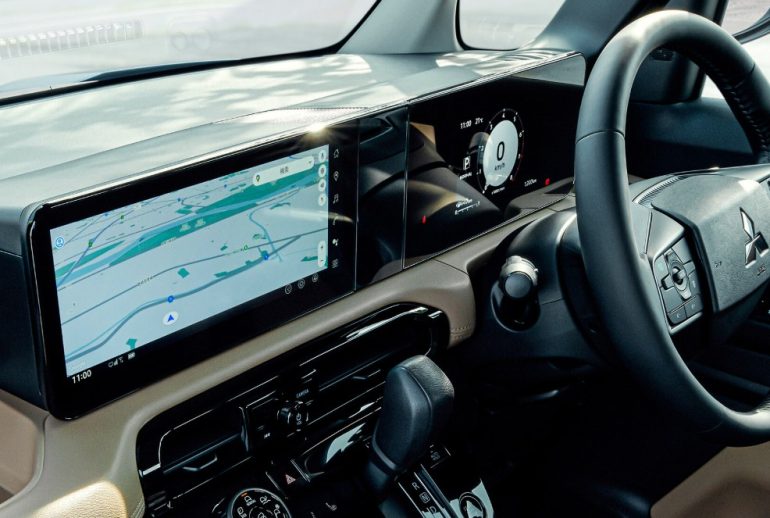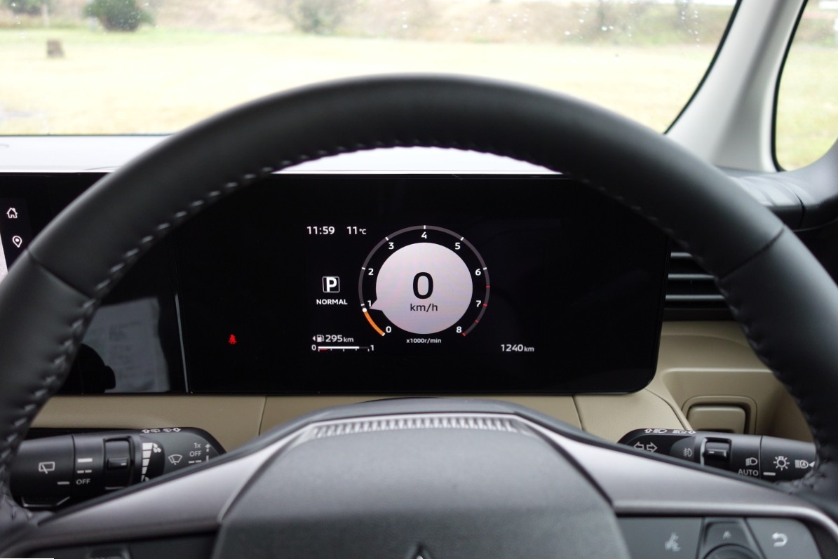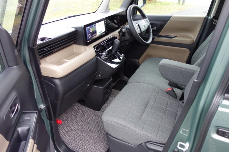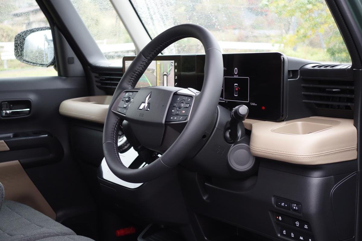 前後席、ラゲッジルームの空間=パッケージは先代を踏襲しているものの、運転席に乗り込めば、メーターから連続する、大型化され、三菱コネクトを採用した、軽自動車初のGoogle搭載ナビゲーション(スマホ接続不要!!Googleの通信料は10年無料。SIMはドコモ)を設定した12.3インチのディスプレーが新鮮だ。