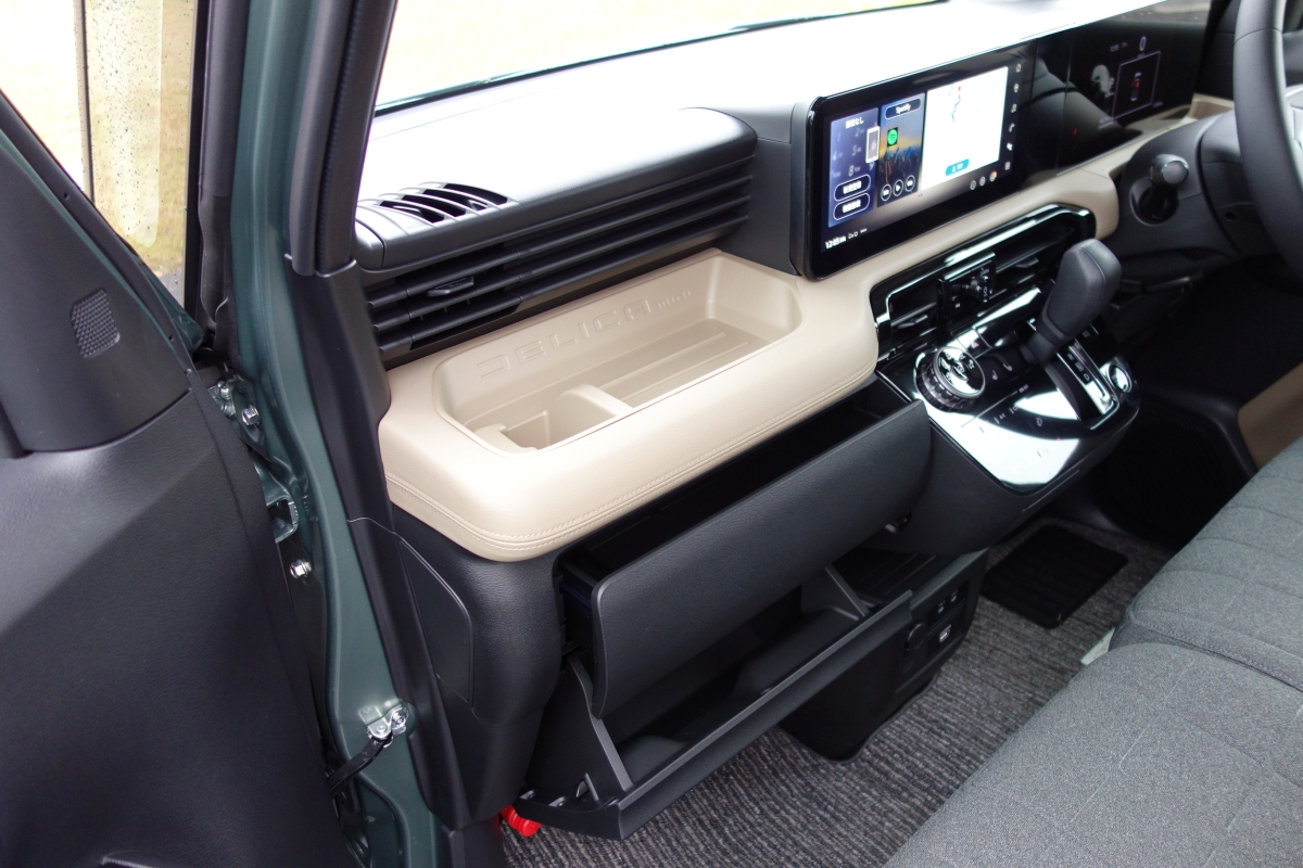 前席周りの収納もたっぷりだ。センターコンソール下のトレイ、助手席側のインパネトレイ、その下の引き出し式収納、グローブボックスと、様々な小物、車内用品をスマートに収納可能である。