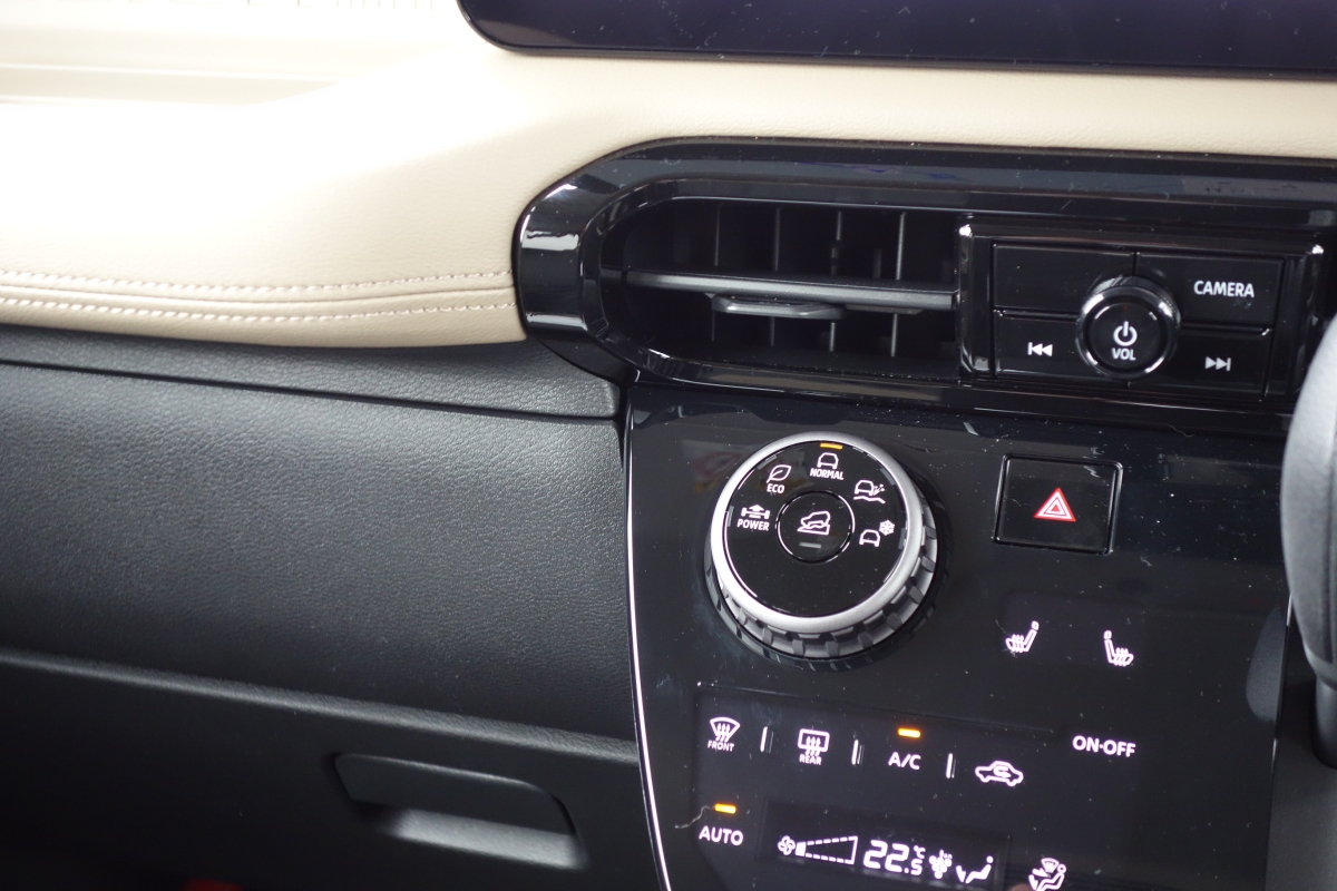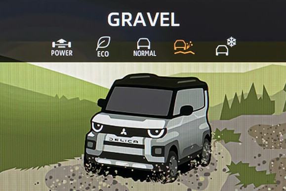 ついでに前輪片輪が完全に滑った状態を再現した特設路も体験したのだが、アウトランダー譲りのドライブモードセレクターを「ノーマル」から「グラベル」(左から4番目。グラベルとスノーモードがデリカミニ専用)にセットしたとたん、ノーマルモードでは前に進まない状況でも、しっかりと駆動力が伝わり、すんなりと前に進むことができたのである。