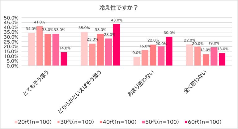 一方で、60代は「とてもそう思う」が1割超(14.0%)と少なく、「冷え性ではない」と感じている人が若い世代より多い結果になった。