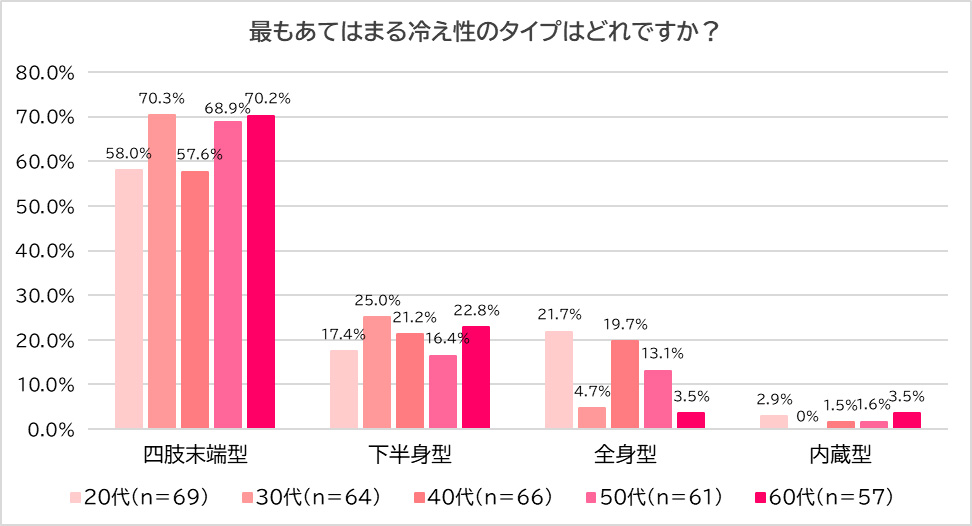 また、「(季節に関係なく、全身の体温が低い)全身型」は20代(21.7%)・40代(19.7%)で比較的高く、体質的な冷えも見逃せない結果となった。