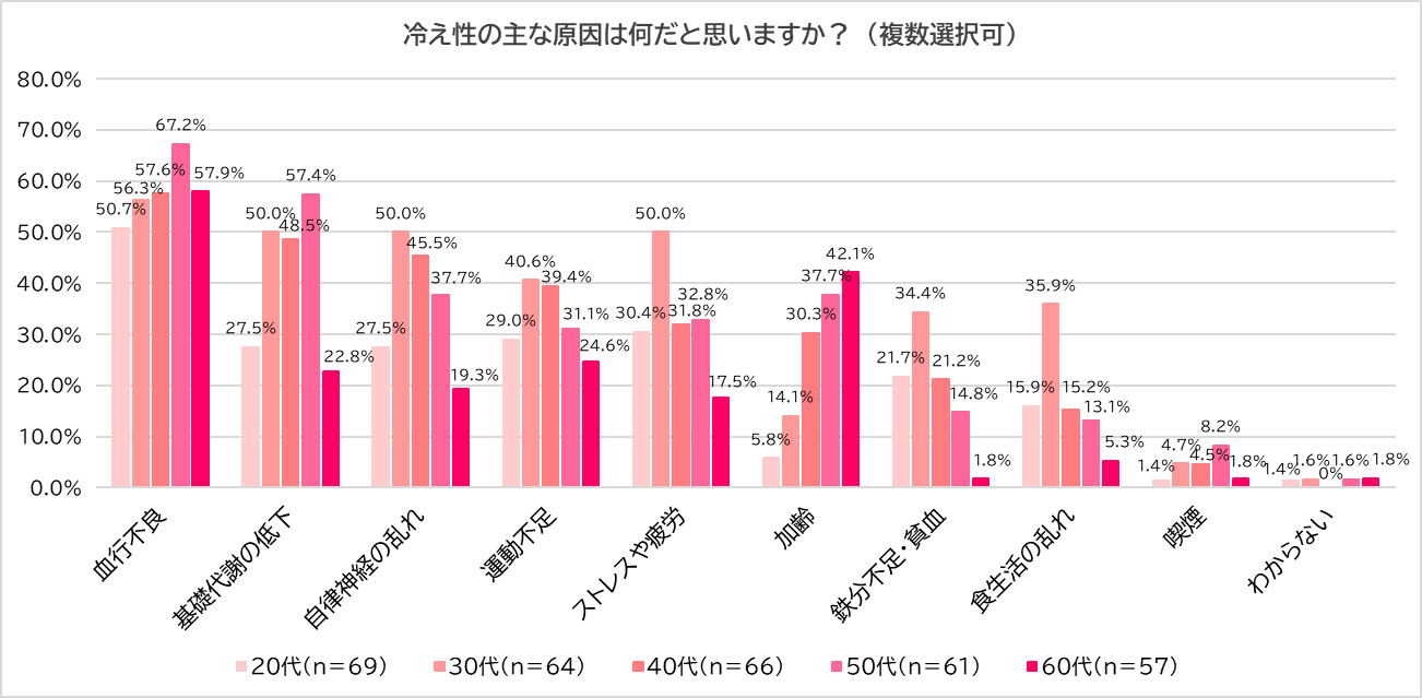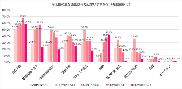 また、30代では「基礎代謝の低下」「自律神経の乱れ」「ストレスや疲労」がどれも半数を占め、「鉄分不足・貧血」「食生活の乱れ」も他の年代に比べ突出しているなど、年代別の特徴も顕著にあらわれた。