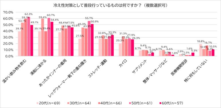 「普段行っている冷え性対策」を聞いたところ、20代・40代・50代では「温かい飲み物を飲む」、20代(同率)・60代では「湯船に浸かる」が最多となり、「あったかインナーの着用」「レッグウォーマー・靴下の重ね履き」も目立った。