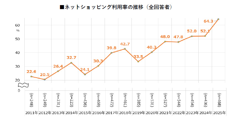 ネットショッピングの利用率は急増、2025年は64.3%が利用経験あり