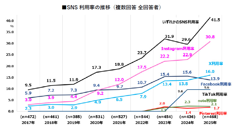 SNS利用率は上昇。特にInstagramは30.8%と、2024年比で7.9ポイントアップ。Xも同じく2.2ポイントアップし、16.0%となった。
