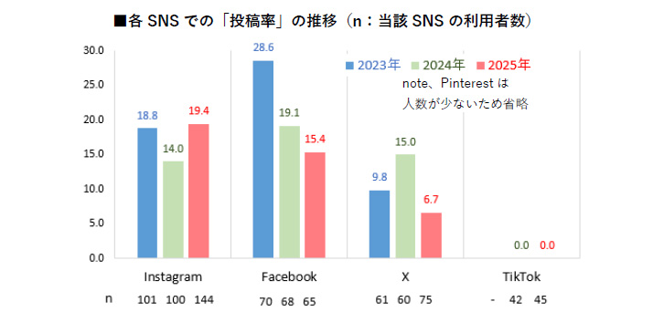 閲覧だけでなく、自分から発信する「投稿率」については、Instagramが19.4%と2024年から上昇している。一方、Facebookの投稿率は低下傾向にあり、2023年の28.6%から15.4%へと大きく減少している。