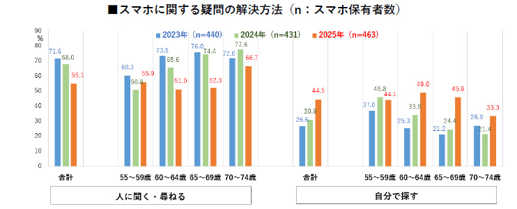 スマホに関する疑問の解決方法について調べたところ、「人に聞く・尋ねる」人は、2023年の71.6%から16.5ポイント低下し55.1%。69歳以下はいずれも50%台に落ち着く一方、70代のみ66.7%と依然高い水準になっている。しかし全体的に「人に頼る」から「自己解決」へのシフトが始まっている。