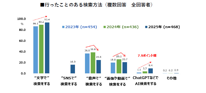 行ったことがある検索方法について調べたところ、「“文字で”検索をする」、「ChatGPTなどでAI検索をする」人が増加していた。特に「ChatGPTなどでAI検索をする」人は2023年比で7.9ポイント増と大きく伸長した。一方、音声や画像、動画での検索利用率は、2024年は上昇したものの2025年は低下傾向となっている。