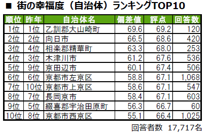 街の幸福度(自治体)ランキングは、5年連続で、乙訓郡大山崎町(おとくにぐん おおやまざきちょう)が1位に輝いた。2位は、3年連続で向日市。3位は、昨年4位から一つ順位を上げた相楽郡精華町(そうらくぐん せいかちょう)となった。