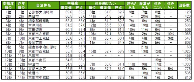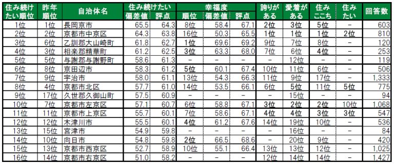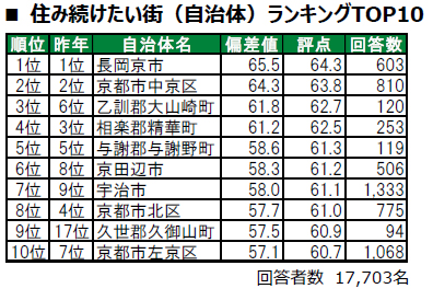 住み続けたい街(自治体)ランキングにおいて、1位は、4年連続で長岡京市となった。2位は2年連続で京都市中京区。3位は、昨年6位から順位を上げた乙訓郡大山崎町となった。その他トップ10内では、9位の久世郡久御山町が昨年17位から順位を上げてトップ10入りしている。