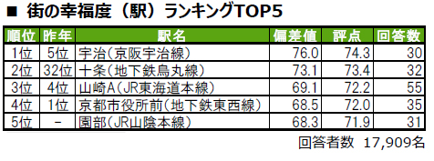 街の幸福度(駅)トップは、昨年5位から順位を上げた宇治