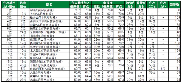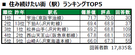 住み続けたい街(駅)ランキングでは、初登場の宇治が唯一偏差値70台の高い評価を得て1位となった。宇治は昨年、累計回答者数が30名未満でランキングの集計対象外だった。