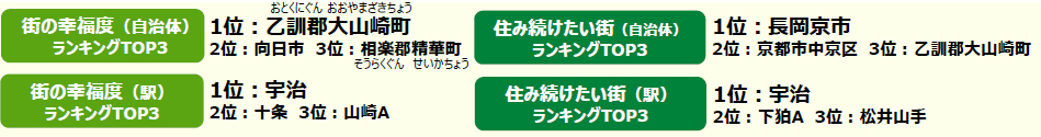 街の幸福度(自治体)ランキングは、5年連続で、乙訓郡大山崎町(おとくにぐん おおやまざきちょう)が1位に輝いた。2位は、3年連続で向日市。3位は、昨年4位から一つ順位を上げた相楽郡精華町(そうらくぐん せいかちょう)となった。