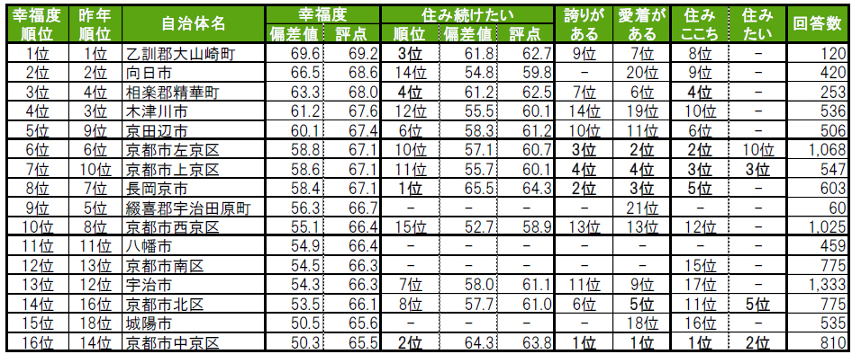 街の幸福度(自治体)トップは、5年連続で乙訓郡大山崎町