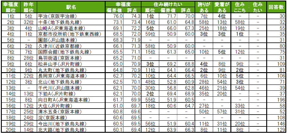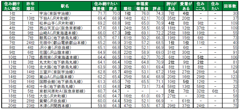 住み続けたい街(駅)ランキングでは、初登場の宇治が唯一偏差値70台の高い評価を得て1位となった。宇治は昨年、累計回答者数が30名未満でランキングの集計対象外だった。