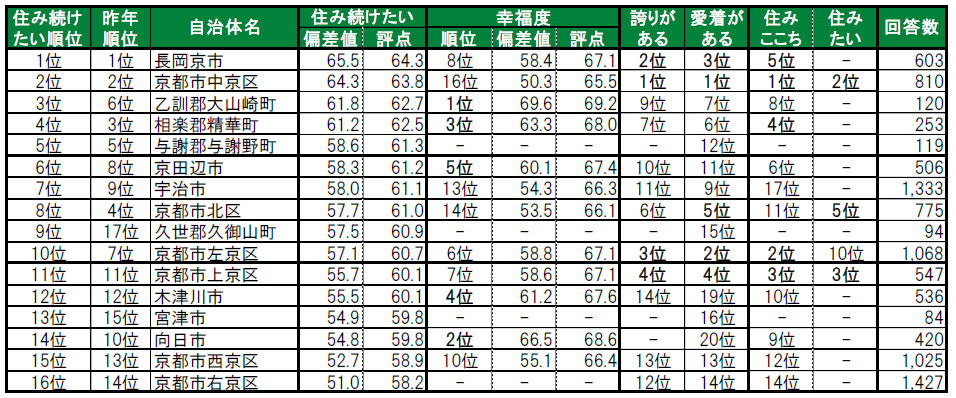 住み続けたい街(自治体)ランキングにおいて、1位は、4年連続で長岡京市となった。2位は2年連続で京都市中京区。3位は、昨年6位から順位を上げた乙訓郡大山崎町となった。その他トップ10内では、9位の久世郡久御山町が昨年17位から順位を上げてトップ10入りしている。