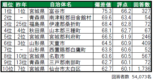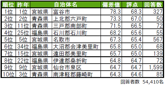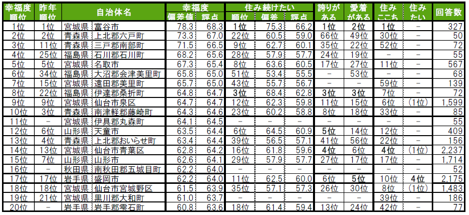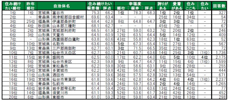 街の幸福度ランキングにおいて、1位は2年連続で宮城県富谷市となり、「住みここち」でも1位の高い評価を得ている。2位も、2年連続で青森県上北郡六戸町。3位は青森県三戸郡南部町で、昨年11位から順位を上げた。その他、4位福島県石川郡石川町(昨年25位)、6位福島県大沼郡会津美里町(昨年34位)、7位宮城県遠田郡美里町(昨年15位)、8位福島県伊達郡桑折町(昨年22位)が、昨年より順位を上げてトップ10入りしている。