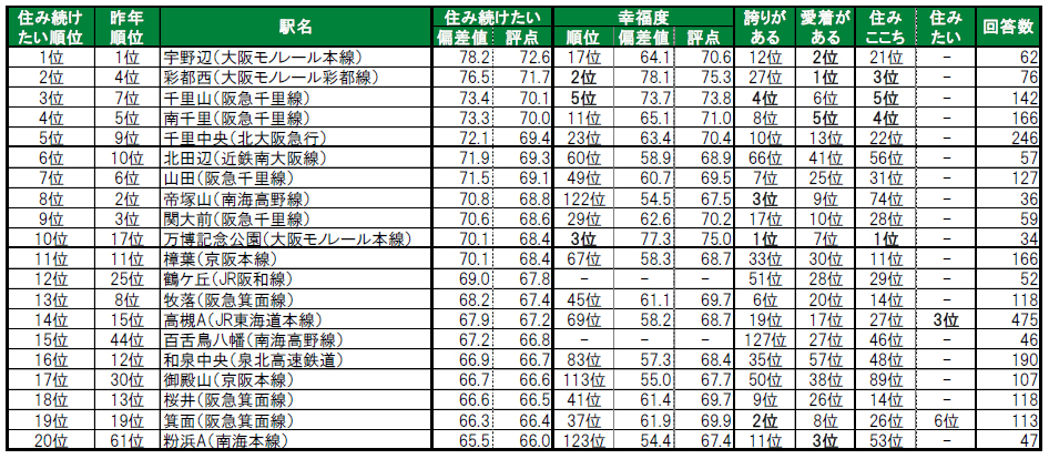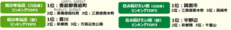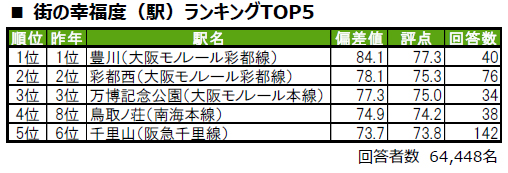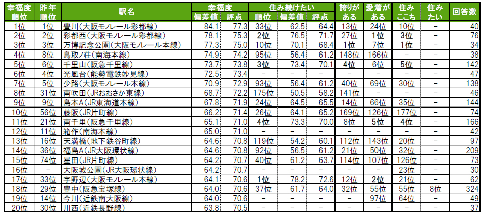 街の幸福度(駅)ランキングにおいて、1位は3年連続で豊川となり、唯一偏差値80台の極めて高い評価を得ている。2位は、2年連続で彩都西。トップ2は、茨木市に位置する大阪モノレール彩都線沿線の駅となっている。