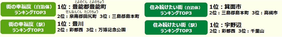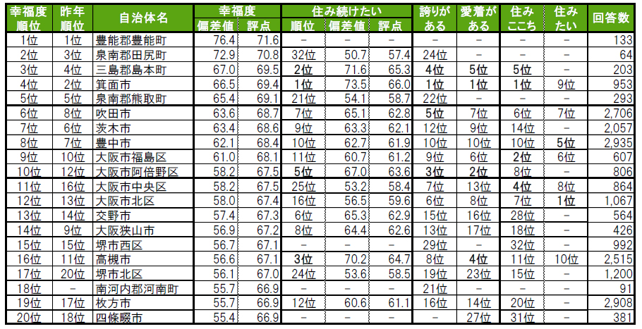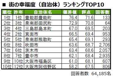 街の幸福度(自治体)ランキングでは、5年連続で、豊能郡豊能町が1位に輝いた。2位は泉南郡田尻町(せんなんぐん たじりちょう)で、昨年3位から順位を上げた。3位も、昨年4位から順位を上げた三島郡島本町。トップ3は、全て郡部に属する「町」という結果になっている。