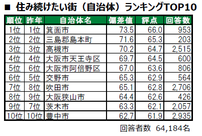 住み続けたい街(自治体)トップは、2年連続で箕面市