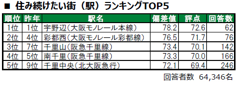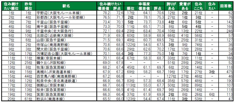 3位は吹田市に位置する千里山で、昨年7位から順位を上げてトップ3入りしている。その他トップ10内では、10位の万博記念公園が、昨年17位から順位を上げてトップ10入りしている。万博記念公園は、「住みここち(駅)」で1位となっている駅だ。