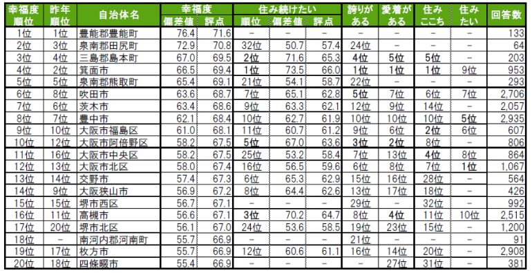 街の幸福度(自治体)トップは、5年連続で豊能郡豊能町