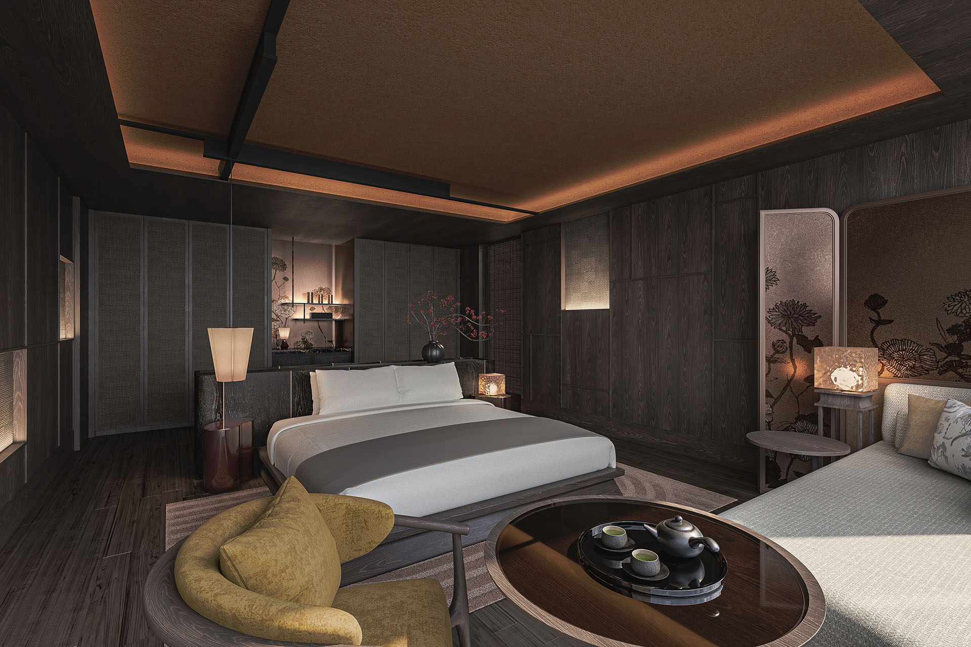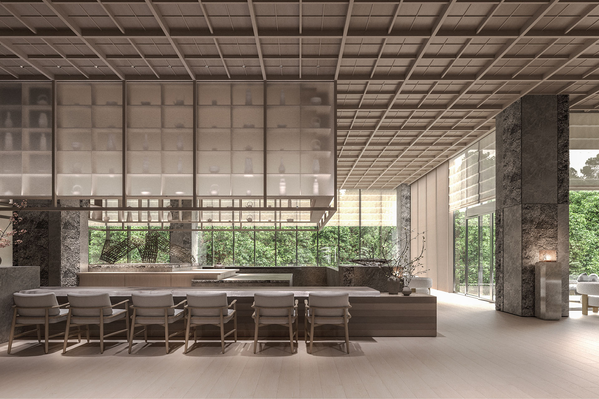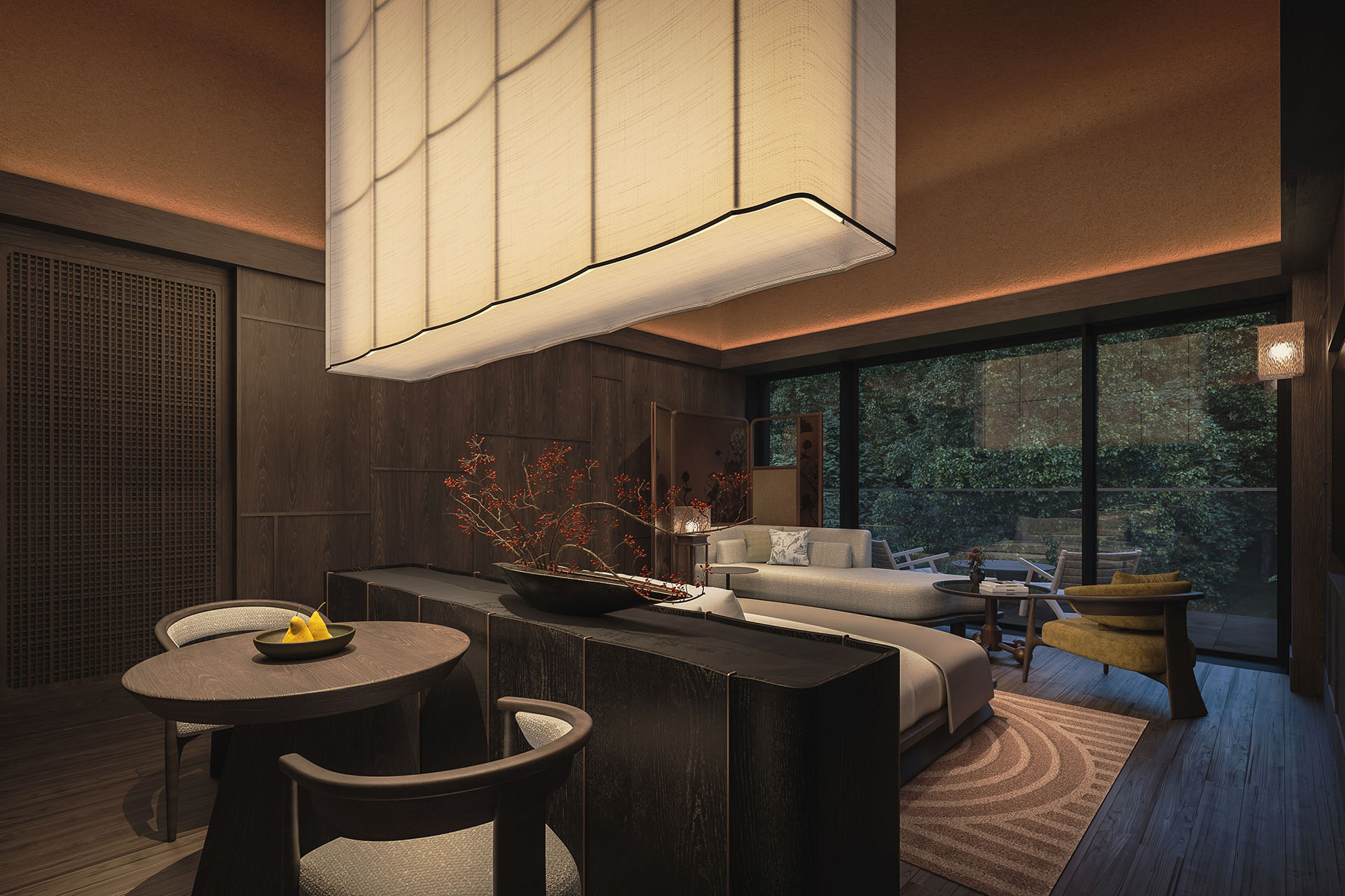 静寂、洗練を感じ、伝統的な日本の建築を意識したインテリアを配し、一面の窓から有馬の自然と緩やかにつながる空間が広がる。また、有馬の自然・湯治文化を存分に体験できる大浴場と貸切風呂も展開予定。