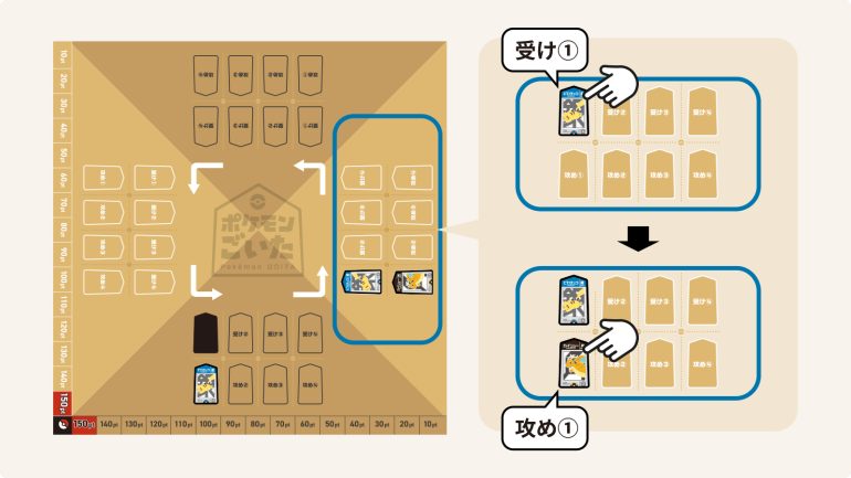 8枚のコマをすべて場に出すとあがりで、コマの左下に書かれた数字の点数がチームに入る。先にチームで150点を獲得すると勝利だ。