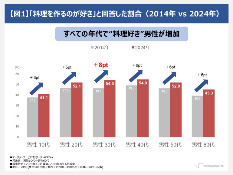 2024年と10年前の2014年を比較すると、各世代で料理への意識の変化が読み取れた。2014年と2024年の男性で「料理を作るのが好き」と回答した人の割合を年代別に比較すると、全年代で増加しており、料理に対する好意的な意識が広がっていた。