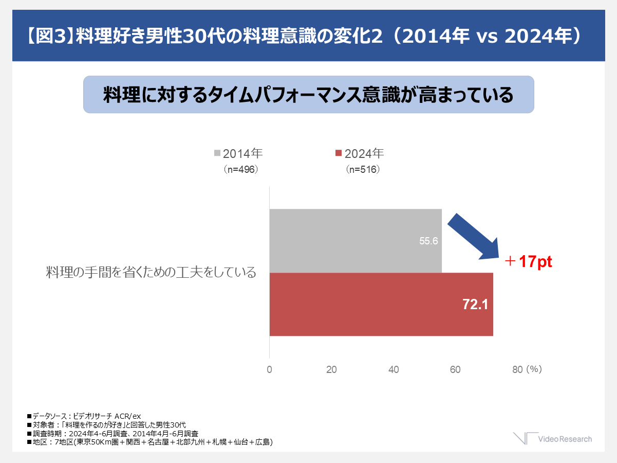 料理が好きな男性30代の料理への意識では、「料理の手間を省くための工夫をしている」(+17ポイント)の上昇が目立った。世代的にも「タイパ(=タイムパフォーマンス)」の意識が高まっており、料理でも効率性を重視した考え方が浸透しているようだ。