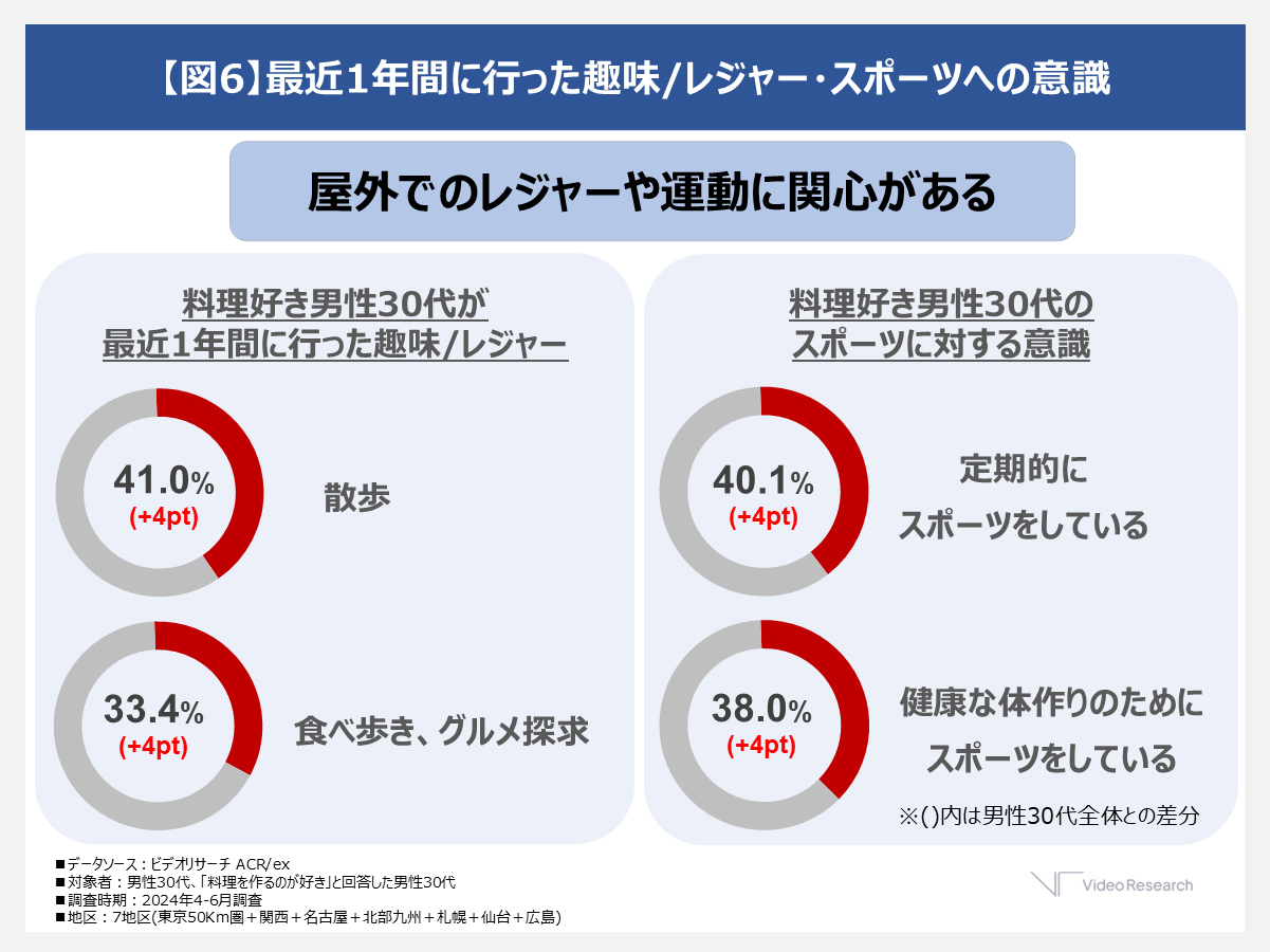料理好き男性30代の土日の起床在宅・睡眠・外出の時間量を「ACR/ex」調査(2024年4月-6月)でみると、男性30代全体と比較して1日あたりの在宅時間が平均10分短く、外出時間は7分長かった。料理好き男性30代が最近1年間で行ったレジャー・趣味活動では、「散歩」(+4ポイント)、「食べ歩き、グルメ探求」(+4ポイント)が男性30代全体よりも高かった。