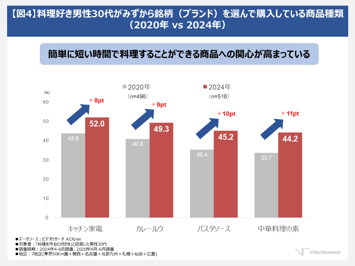 料理関連の商品への関心では、銘柄(ブランド)を選んで購入している傾向もあった。2020年には「キッチン家電」のブランド選定・購入に関わる料理好き男性30代は4割程度だったが、2024年には5割以上に拡大している。「カレールウ」や「パスタソース」、「中華料理の素」など簡単に短い時間で料理できる食品にも関心が集まっていた。