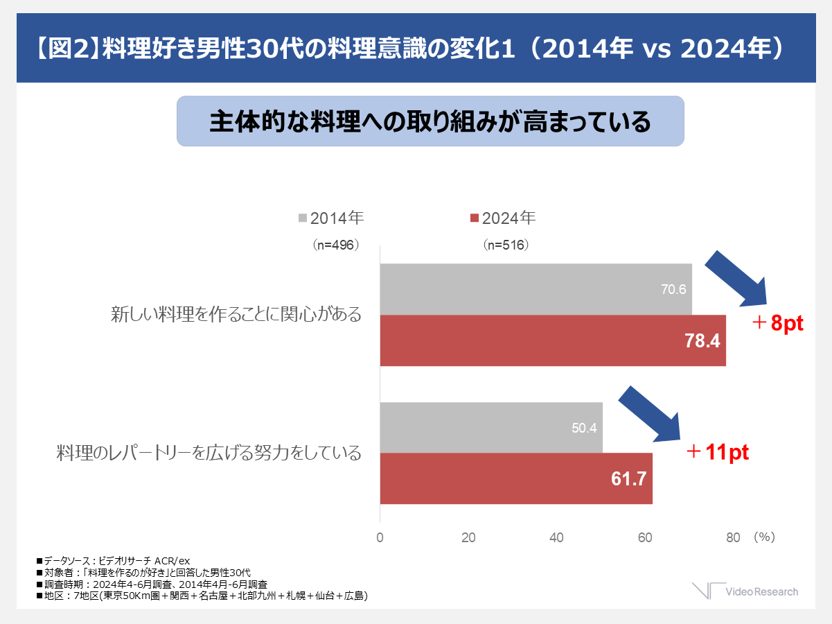 10年間でもっとも伸びた「料理好き」な男性30代に着目すると、「ACR/ex」の10年前の調査結果と比較して特に上昇がみられた料理への意識は、「新しい料理を作ることに関心がある」(+8ポイント)や「料理のレパートリーを広げる努力をしている」(+11ポイント)など主体的に料理に取り組む姿勢だった。