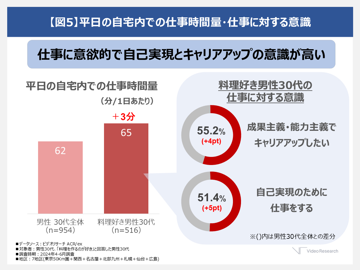男性30代全体と比較して、料理好き男性30代は在宅勤務がやや多いようだ。仕事に対する意識では、男性30代全体と比較して料理好き男性30代は「成果主義・能力主義でキャリアアップしたい」(+4ポイント)、「自己実現のために仕事をする」(+5ポイント)などが高く、仕事に対する意識の高さもみられた。