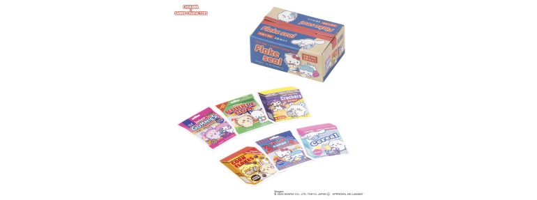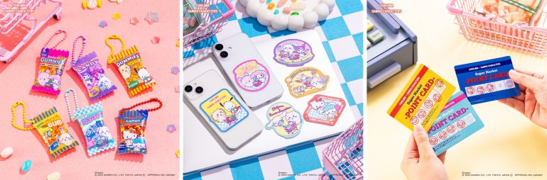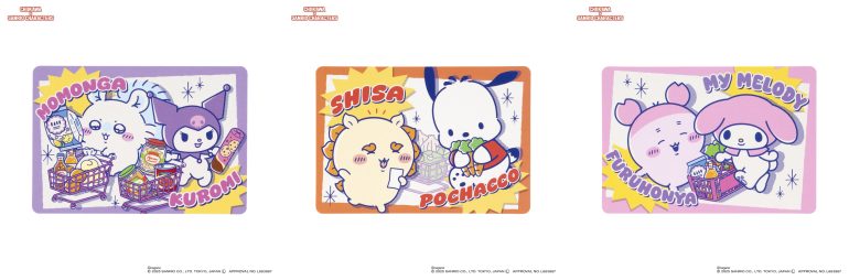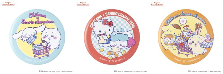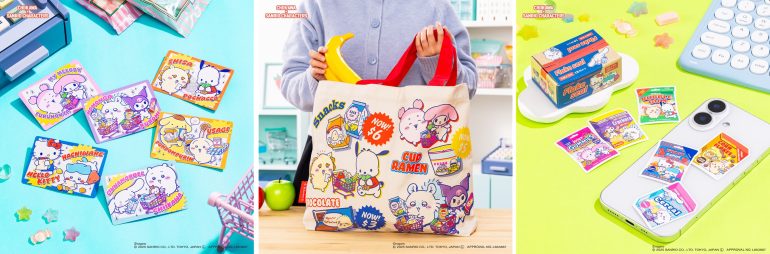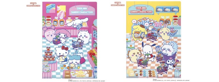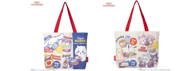本コラボアイテムのデザインテーマは“スーパーマーケット”。ちいかわとシナモロール、ハチワレとハローキティ、うさぎとポムポムプリン、モモンガとクロミ、シーサーとポチャッコ、古本屋とマイメロディのペアが、なかよく買い物を楽しんでいるキュートなデザインで登場する。